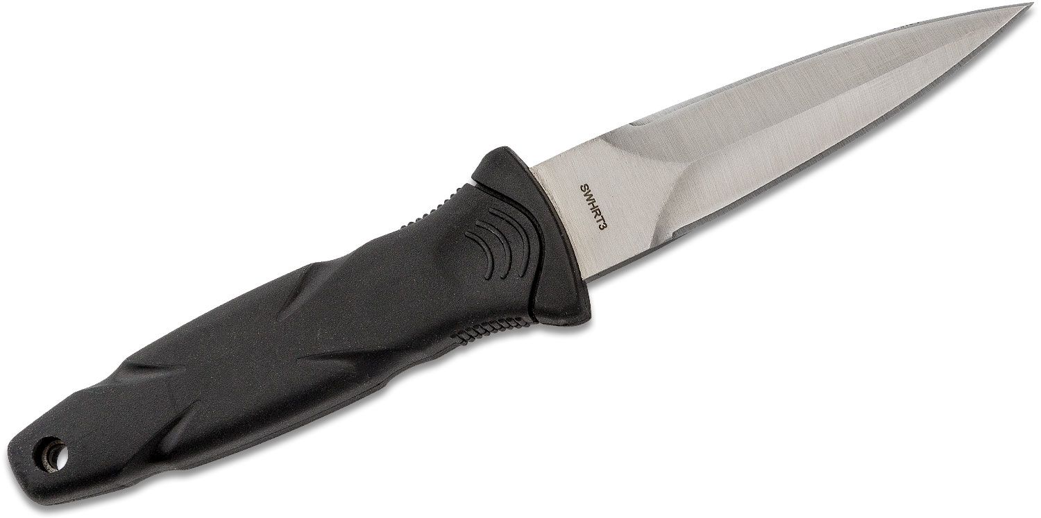 Smith & Wesson H.R.T. Full Tang Fixed Blade Knife is made out of high carbon stainless steel dual edged spear point blade, black TPR handle with lanyard hole and black nylon/fiberglass belt/boot sheath with six grommet holes for lashing to pack or gear. *Note- does not sell in CA, NY, MA.