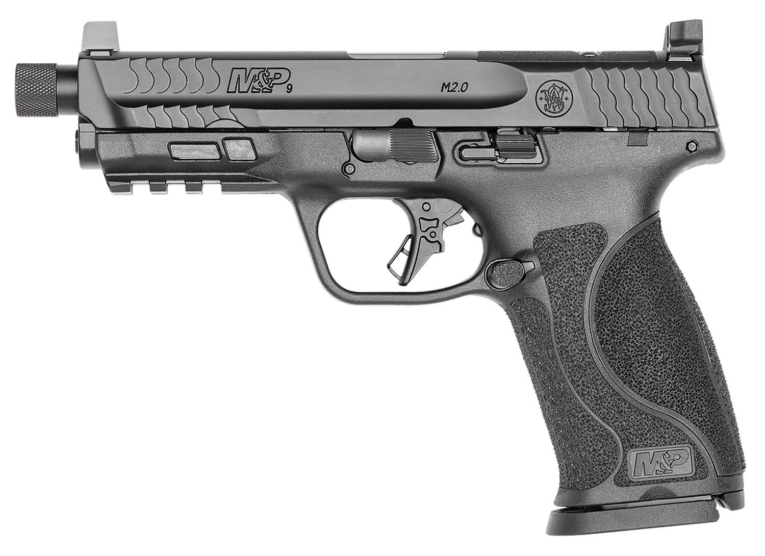 Smith & Wesson, M&P9 M2.0, Striker Fired, Semi-automatic, Polymer Frame Pistol, Full Size, 9MM, 4.625" Threaded Barrel, 1/2x28, Armornite Finish, Black, Optic Height Sights, Optics Ready Slide, No Manual Safety, Flat Face Trigger with Integrated Trigger Safety, 17 Rounds, 2 Magazines