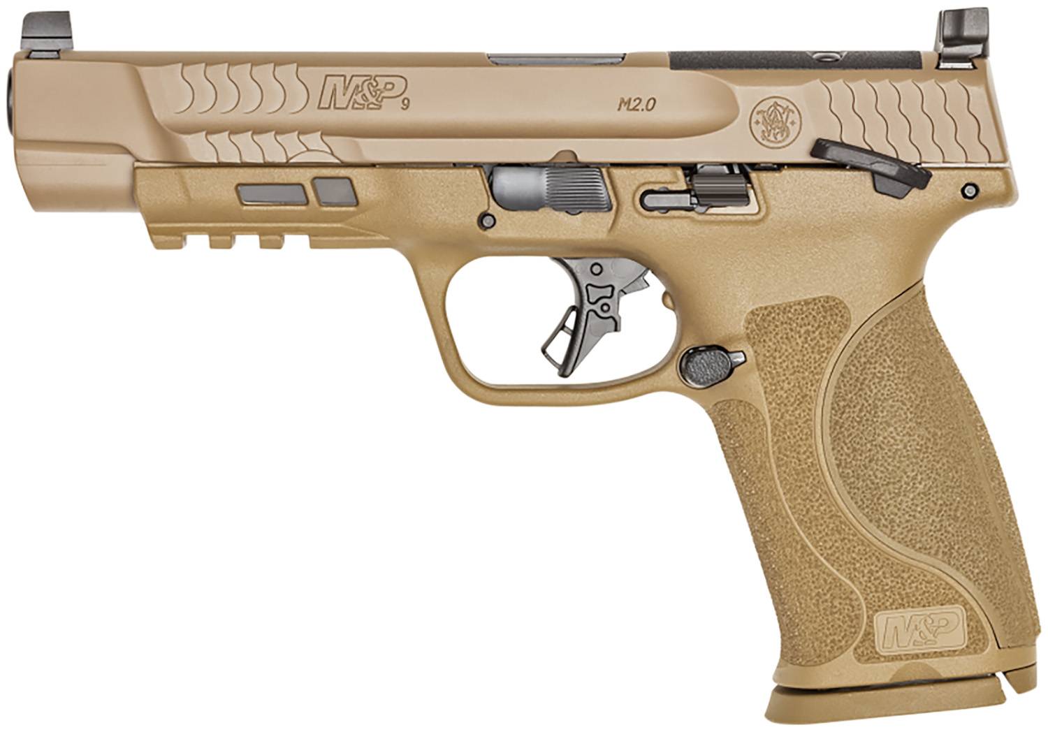 Smith & Wesson, M&P9 M2.0, Striker Fired, Semi-automatic, Polymer Frame Pistol, Full Size, 9MM, 5" Barrel, Optics Ready, Armornite Finish, Flat Dark Earth, Aggressive Grip Texture, 3 Dot Sights, 17 Rounds, 2 Magazines