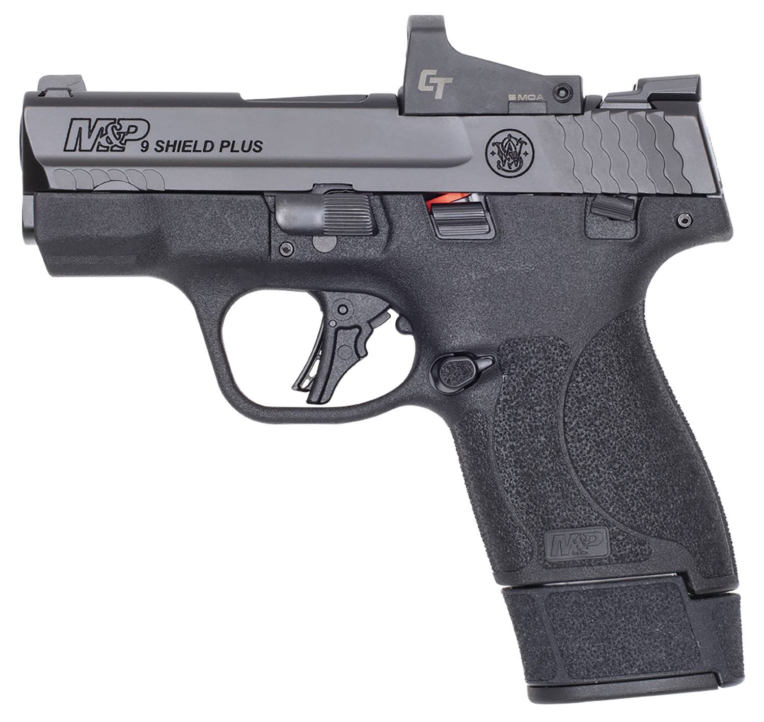 Smith & Wesson, M&P9 Shield Plus OR, Striker Fired, Semi-automatic, Polymer Frame Pistol, Micro Compact, 9MM, 3.1" Barrel, Armornite Finish, Black, Tritium Night Sights, Optics Ready, Thumb Safety, 3 Magazines, (2)-15 Rounds and (1)-10 Rounds, Zippered Notebook Case, Crimson Trace CTS-1500 Red Dot Optic
