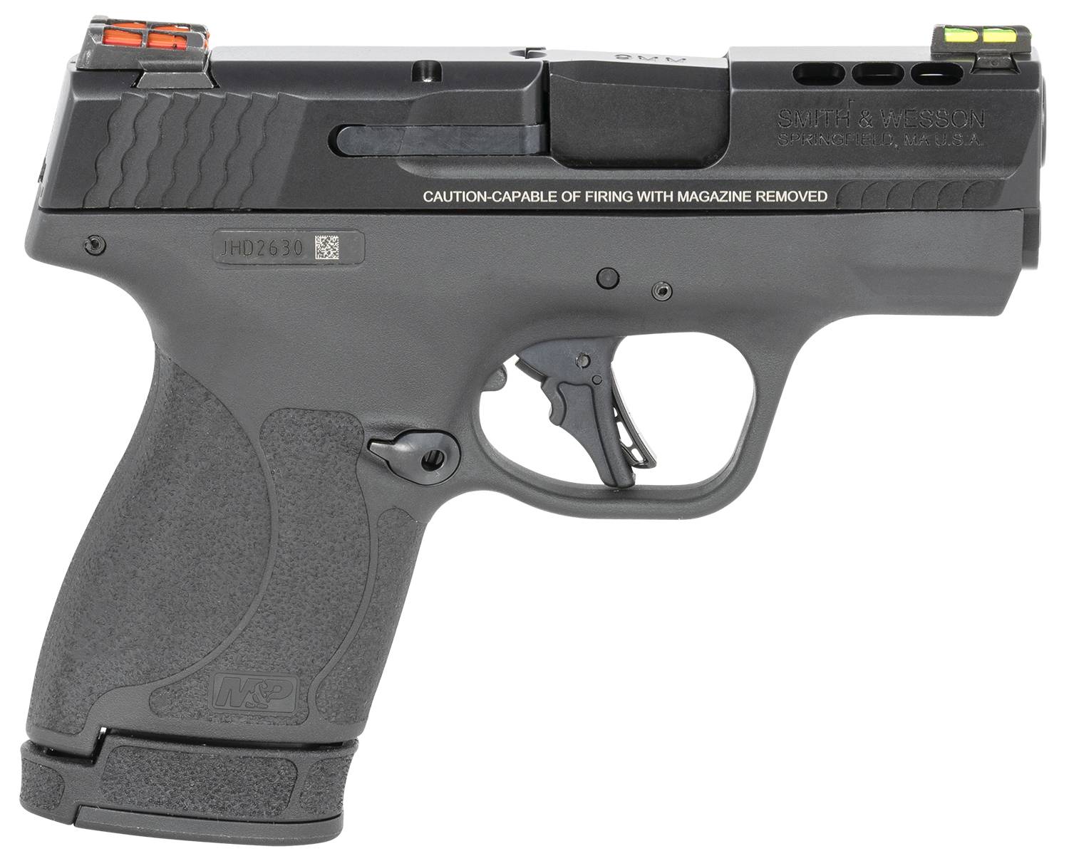 Smith & Wesson, M&P9, Shield Plus, Performance Center, Striker Fired, Semi-automatic, Polymer Frame Pistol, Micro-Compact, 9MM, 3.1" Ported Barrel, Armornite Finish, Black, Fiber Optic Sights, Manual Thumb Safety, EDC Kit (Oasis Liner Lock, Folding Knife and Delta Force CS LED Flashlight), Flat Face Trigger, 2 Magazines, (1) 10-Round and (1) 13-Round