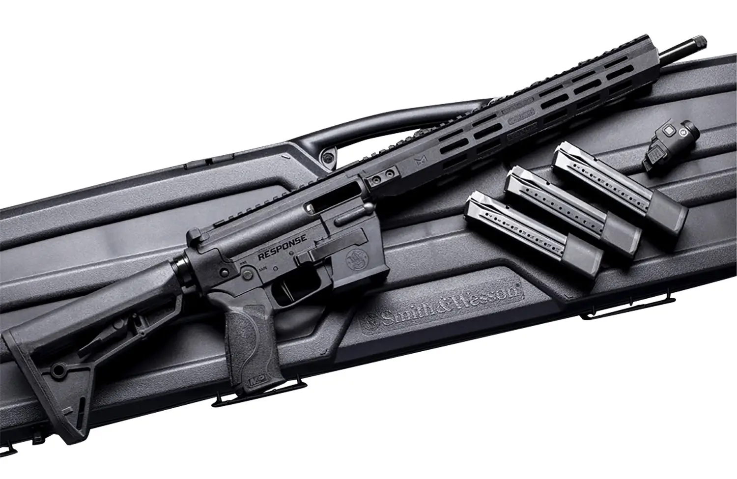 The Smith & Wesson Response breaks barriers for those looking to enter the pistol caliber carbine market. With its innovative FLEXMAG System, you can use a wide range of double stack 9mm pistol magazines from S&W and other manufacturers. The familiar MSR controls make it an easy transition for those looking to use on the range and with the ability to change parts with existing MSR accessories, it makes optimizing to your needs easy. Includes Crimson Trace Rail Master Tactical Light, three magazines and carry case.