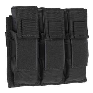 TAC SHIELD MOLLE Pistol Magazine Pouch is designed with durability and ease of use in mind. The tough 1000 Denier Nylon with special liner protects your magazine. The Mil-Spec 1" webbed flap is double thick ensuring vigorous dependability. The heavy duty elastic retention strap and hook/loop holds your loaded magazines tight, while the handy pull tabs ease deployment with or without gloves. Special reinforcements with double stitching and bar-tacks in high wear and stress points deliver exceptional performance. The Universal Triple Pistol fits popular pistol magazines either a double or single stack. It holds (3) Double or Single Stack Magazines.