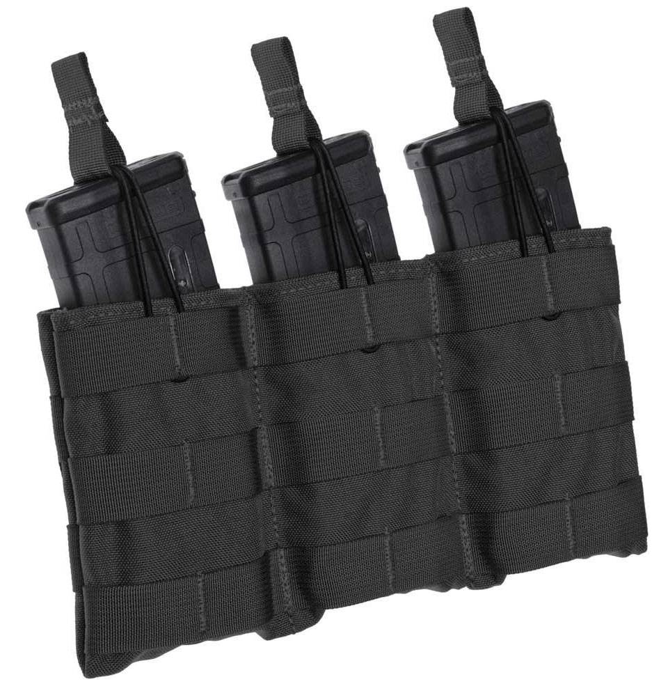Triple SPEED LOAD MOLLE Pistol Magazine Pouch is designed with durability and fast reloading of your pistol in mind. Constructed with tough 1000 Denier Nylon exterior and blackened grommets that serve as convenient drain holes. Magazines are retained with top quality elastic cords and convenient pull tabs. Just flip them over when needing quick access when things get fast and furious.