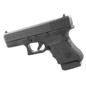This item fits Glock Model 29SF/30SF/30S/36 (Gen3). This rear wrap grip provides full coverage on the side panels including above the thumb rest, ample coverage on the backstrap, and two finger wraps for the finger grooves under the trigger guard. This grip has a logo cutout for the Glock emblem on the left side of the handle. This grip sticks extremely well even with the Rough Textured Frame (RTF).