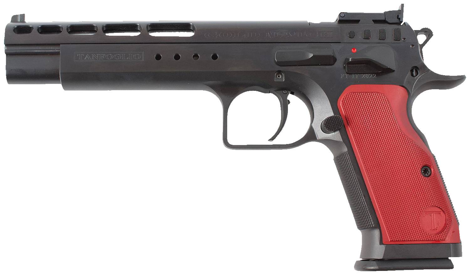 An evolution from the the old Hunter series. The Gold Match is unique among Tanfoglio models, with its 6" barrel. The Gold Match features a blued finish which underlines lighter. ported slide.