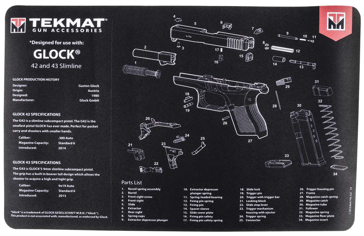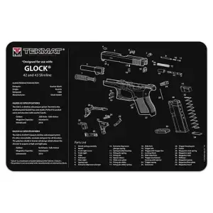 The Tekmat Glock 42-43 gun cleaning mat measures 11 x 17 and is 1/8 thick. The over-sized design gives you plenty of room to disassemble your handgun and to clean it without having to move parts all over. This mat comes with an overview of the history of the Glock 42-43 as well as a simple to follow parts diagram of the parts that make up your Glock.