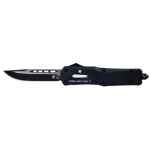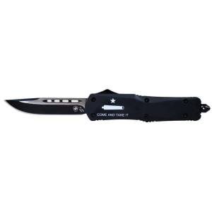 Templar Knife out the front (OTF) knives feature a double action mechanism that is reliable when you need it. All of our knives also have a built-in safety feature. If the blade meets any resistance before locking out it will stop. So, in the event of it opening in your pocket you don't have to worry about the blade being fully deployed. The blade can be re-set by pulling it to the locked position. Once this is done the knife is back in operation. Features a glass breaker and pocket clip. Each Knife includes a black box and a nylon sheath. Handle is black aluminum alloy with "Come and take it" w/gun on one side and "Come and take it" on the other side.