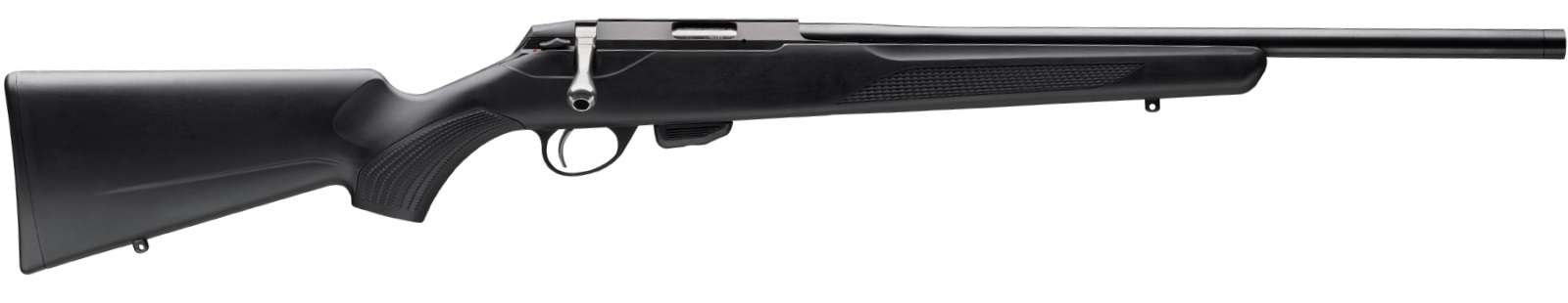 The Tikka T1x MTR rimfire rifle is designed to handle a wide range of shooting tasks. The action shares the same bedding surfaces and inlay footprint with the centerfire T3x rifle. Its unique cold-hammer forged barrel has a cross-over profile, which offers you the benefits and stability of a heavier barrel without noticeably increasing the overall weight. The modular synthetic stock has an interchangeable pistol grip, and an additional attachment point which allows you to change the width of the stock's fore-end. The grip also features an asymmetrical pattern and shape. Tikka T1x utilizes a stainless steel bolt and 10-round magazine. It's a rimfire rifle of unparalleled quality and craftsmanship that performs perfectly at the range and in rough terrain. This 22LR model has a 20" barrel and a black finish.