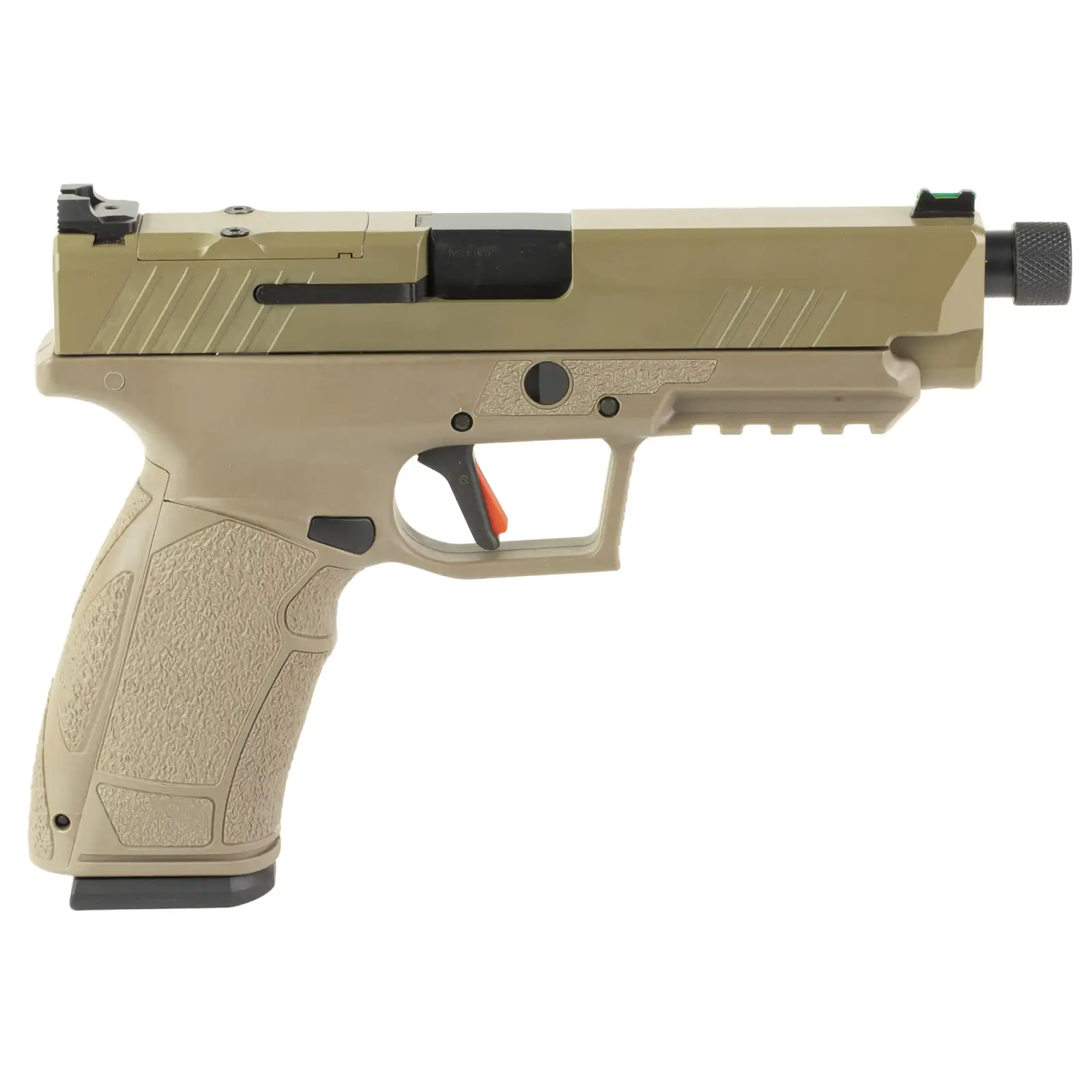 PX-9 Gen3 Tactical FDE Semi Automatic Pistol 9mm - FDE Polymer Frame w/ Integrated M1913 Rail - Hammer Forged Barrel w/ 1/2X28 Threads Protector Incl. - CNC Machined Slide with Forward & Rear Serrations FDE Cerakote Finish - RMR Cut Slide for Mounting Optics - Customizable Grip w/ Interchangeable Side Panels & Backstrap Offering 27 Grip Configurations - Includes one each 20rd and 18rd. Standard Capacity Magazines w/ Loader (SIG 226 Pattern) - Fixed Rear Sight w/ Fiber Optic Front (Glock 9/40) Cut) - Removable Flared Magazine Well Adapter - IWB Holster Included