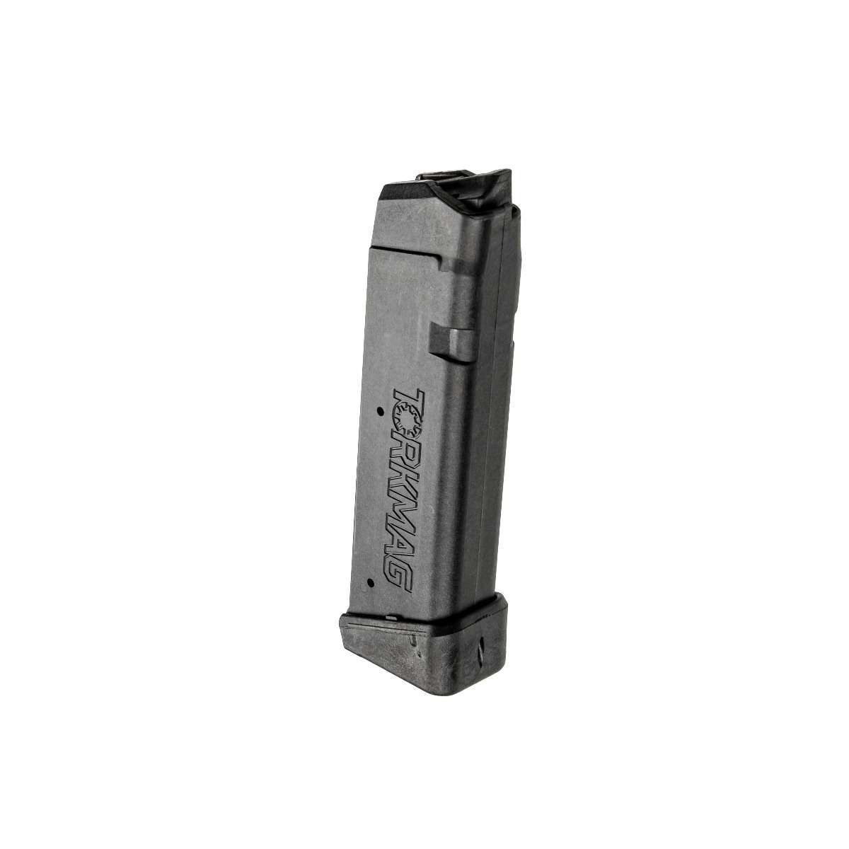 The 20rd TorkMag is the same size as a factory 17-round magazine with +2 extension. The included baseplate allows for quick retrieval from a pouch under stress. All injection molded with metal replacement polymer made right here in the U.S. The TorkMag has ambidextrous mag catches to ensure accessibility. An AR15 mag catch is also molded into the left side of the main tube to allow out-of-the-box use with our Magdapt 17 conversion kit for pistol-caliber AR carbines. Two witness holes indicate when the mag is loaded with 10 and 20 rounds. DISCLAIMER: This product is not manufactured, authorized, endorsed, or warranted by GLOCK. GLOCK does not warrant or represent that this product is compatible with GLOCK pistols.