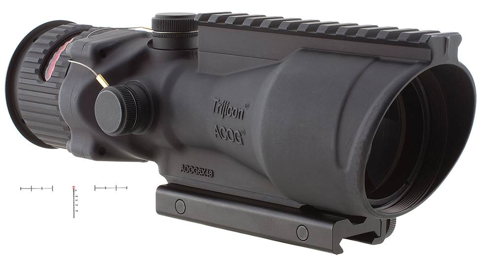 The ACOG is internally-adjustable, compact telescopic sights with tritium illuminated reticle patterns for use in low light or at night. It combines traditional, precise distance marksmanship with close-in aiming speed. This model's design if for use with the M16 family, every feature of its mechanical and optical design was chosen for a single purpose, to provide increased hit potential in all lighting conditions. Includes Picatinny Rail adapter, LENSPEN, lanyard assembly for adjuster caps, Trijicon logo sticker, ACOG manual and warranty card.