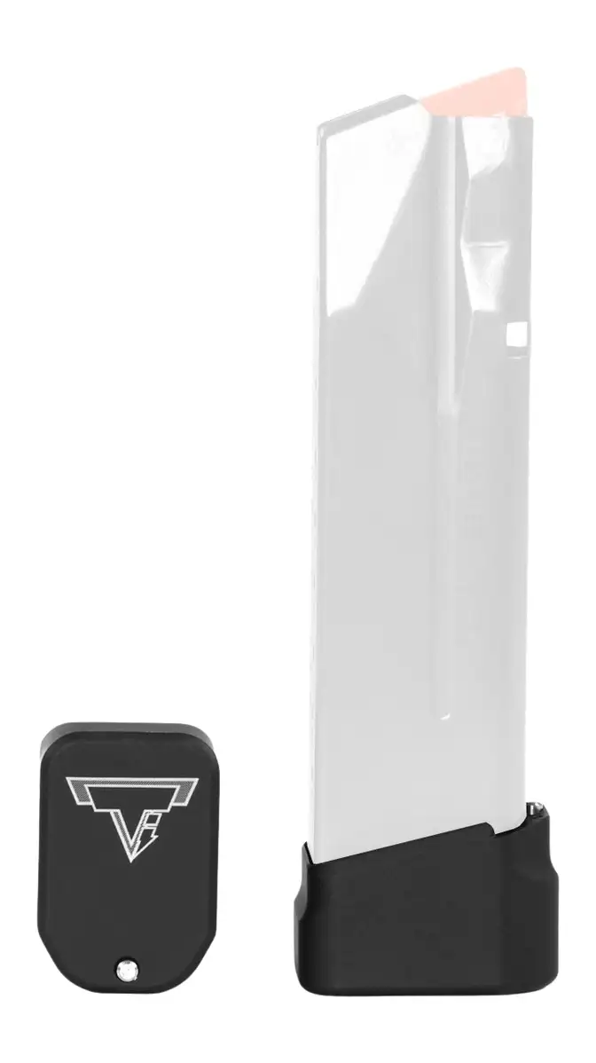 Taran Tactical Innovation Versatile Base Pad, Magazine Extension, +4 Rounds to Mec-Gar Beretta 92 (18) Round Magazine, +3 Rounds to Sig P365 X-Macro (17) Round Magazine, +5 Rounds to Sig P226 (15) Round Magazine, +4 Rounds to Walther PDP (18) Round Magazine, Anodized Finish, Flat Black BM9BPV2-00