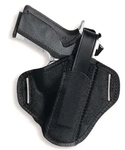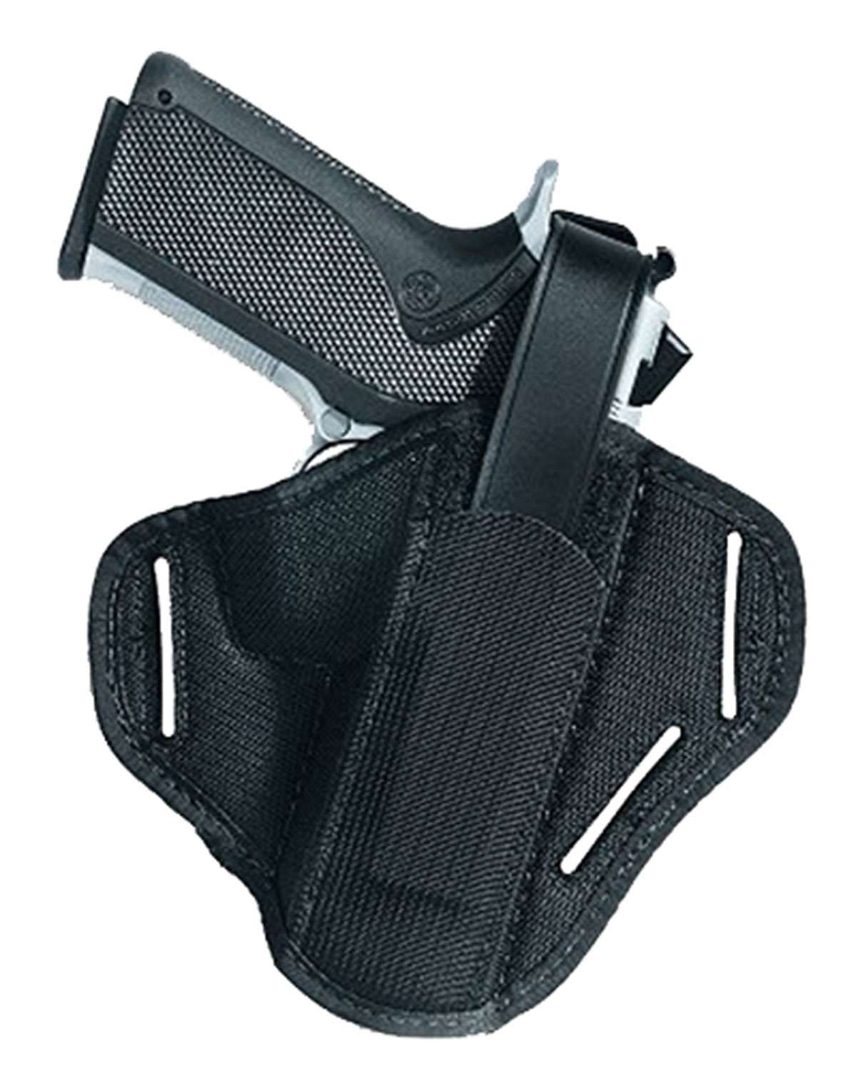 Uncle Mikes Super Belt Slide holster efficiently retains concealed, shrouded or spurless hammered guns. It uses an internal retention mechanism and the internal locking device fits into revolver trigger guard. A separate sewn down retention strap fits positively over gun frame. The Super Belt Slide holster is constructed of Kodra nylon which is highly abrasion resistant as well as water resistant.