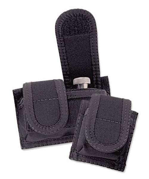 Universal speed loader pouch. Holds 1 .38 to .45 caliber speed loader. Cordura divider. Hook-and-loop close. Fits up to 2.25" belts, made of Cordura nylon. Comes in black.