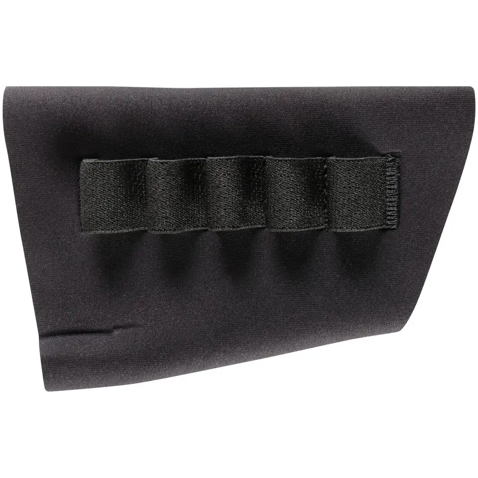Neoprene shotgun buttstock shell holder holds 5 shells. Heavy-duty neoprene sleeve slips over shotgun stock. Non-slip surface. Sewn-on elastic loops. Comes in black.