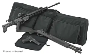 US PeaceKeeper's 3-Gun case carries everything to the range. The main compartment features a webbing system with adjustable straps to secure two long guns, and a 0.5" thick padded divider protect each gun. The exterior has two 15" x 9" x 2.5" pockets and one 7.5" x 9" x 2.5" pocket which are also padded to protect ammo and a variety of range gear. The 3-Gun case includes a zippered handgun case (14 x 7.5 x 1.25) with Tricot lining. Reinforced wrap-around handles and padded sling strap for carry options, and double zippers allow the case to be locked. It weighs 5.4 lbs.