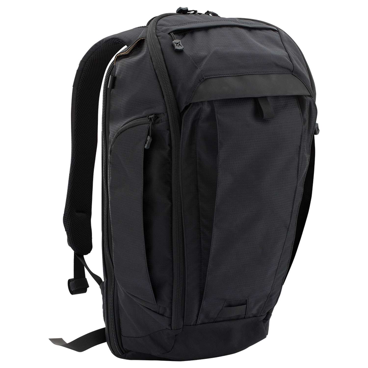 The Gamut Checkpoint, by Vertex, is a weapon-compatible concealed carry platform with Velcro brand loop lining and a rapid access pull tab. The main compartment opens 180 degrees and has a convertible front flap which stows behind loop-faced MOLLE webbing panel to provide ready access to items mounted there and to rapidly change the bag's appearance. The modular padded laptop sleeve adjusts in size and position and adapts to become a print-proof protective scabbard for weapon or sensitive gear. Its main flap has an interior zippered mesh pocket and three Velcro brand loop panels, one with five gear slots, plus an external zippered pocket with a zippered non-abrasive mesh pocket and a key lanyard. 3-D molded foam back panel enhances airflow and comfort and has a passthrough for rolling luggage handles. The hot-pull tab can be set up for quick access to the main compartment. The Gamut Checkpoint is constructed of bonded nylon thread throughout with critical seams and attachment points bartacked for extra durability, YKK self-repairing nylon coil zipper, and quiet positive-grip zipper pull tabs. It also features light-colored interior, an adjustable shoulder and sternum straps, adjustable waist belt which tucks away when not in use, and snaps on the front flap zipper that pulls to prevent accidental opening and enable front flap to convert to a sling for larger items. The bag is hydration bladder compatible with dual hose pass-through ports and accommodates up to 15" laptops.