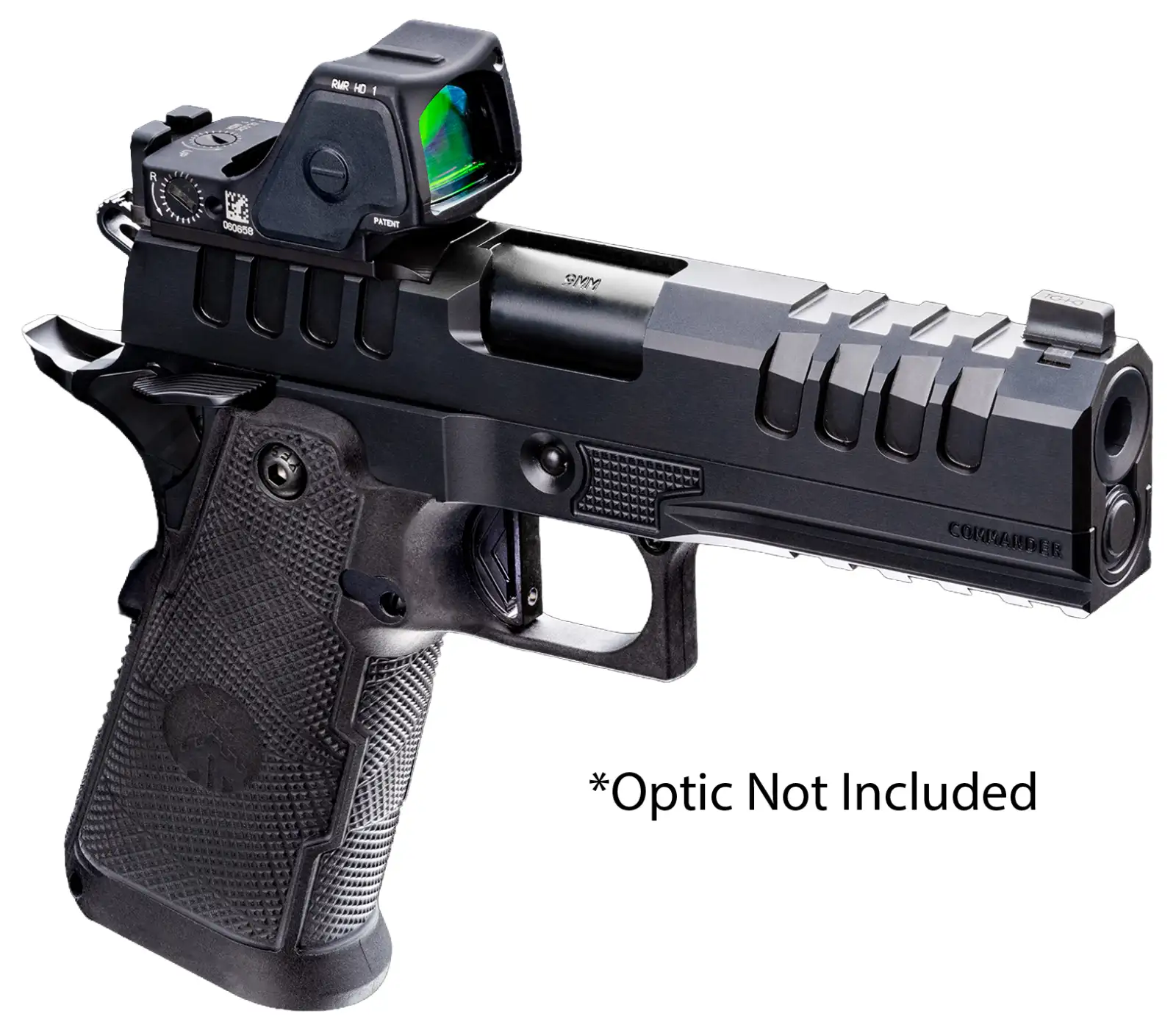 Introducing the TACTICAL COMMANDER. This innovative double-stack 1911 features a lightweight aluminum frame specifically engineered for professionals who demand a modern fighting handgun without compromise. The TACTICAL COMMANDER is a trusted choice for those who require capability control and reliability in a daily carry or operational sidearm. - The concept of grip and rip is more than just a slogan; it's a necessity. The TACTICAL COMMANDER is the first in its class to offer an all-new aluminum frame designed to provide a lightweight yet uncompromisingly reliable sidearm. It is built for individuals who move with purpose and operate without hesitation. When every second counts and control is essential this platform delivers exceptional performance. - Pistol Type: Commander Double-Stack 1911 - Action: SAO Hammer-Fired - Caliber: 9x19mm - Frame: 7075 Aluminum - Slide: 416R Stainless Steel - Barrel Material: 416R Stainless Steel - Barrel Length: 4.1 in. (104.14 mm) - Rifling Twist: 1:16 / 6R - Recoil System: 14 lb. - Grip: Kevlar & Carbon Fiber Composite (MJD) - Safety: Ambidextrous - Trigger: Duty Tuned - Length: 7.9 in. (200 mm) - Width: 1.6 in. (41 mm) - Height With Standard Magazine: 6.2 in. (155 mm) - Dry Weight: 25.8 oz (Without Magazine & No Optic) - Magazines Included: Three (3) 1x 17-Round - Front Sight: Tritium (Green) - Optic Cut/Plate: RMR Cut (Included Plate) - Protection: Black Nitride - WATCHTOWER Soft Pistol Case - TACTICAL COMMANDER Double-Stack 1911 - 3x 17-round Magazines - 1x Pistol Lock - Lifetime Warranty Card