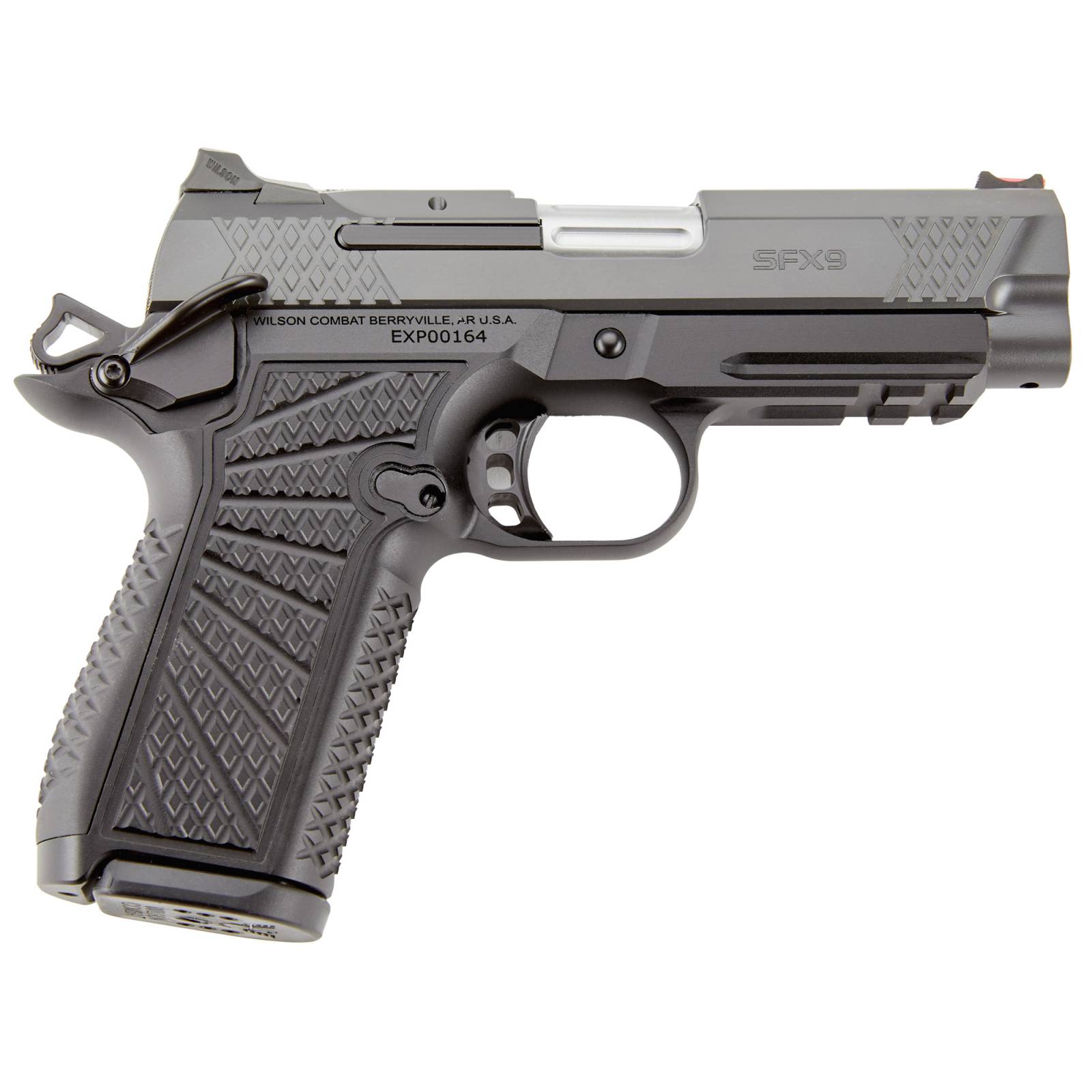Wilson Combat, SFX9, Single Action Only, Semi-automatic, Metal Frame Pistol, Compact, 9MM, 4" Barrel, DLC Finish, Black, Front and Rear X-Tac Slide Serrations, Ambidextrous Safety, Fiber Optic Front Sight, Integrated Light Rail, 15 Rounds, 2 Magazines