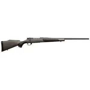 Weatherby's Vanguard rifles are guaranteed to shoot a 3-shot group of .99" or less at 100 yards (SUB-MOA) from a cold barrel when used with Weatherby factory or premium ammunition. Vanguard rifles are equipped with a match quality, two-stage trigger (adjustable down to 2.5 lbs.) and a 3-position safety, with the middle position allowing the shooter to work the action while safety is still engaged.The Vanguard action incorporates a one-piece machined bolt body, fluted for reduction in weight and bearing surface area, while eliminating binding for smooth action. Three gas ports allow high-pressure gases to escape laterally in the event of an accidental case rupture, and the massive M-16-style extractor ensures reliable and positive extraction. Vanguard rifles have a one-piece machined receiver featuring an integral recoil lug for the utmost in strength and structural integrity, along with a one-piece trigger guard with a hinged floorplate for easy access to unfired cartridges in the magazine. The lightweight, composite Monte Carlo Griptonite stock has pistol grip and forend inserts and a right side palm swell aids in control and shooter comfort. It has a bead blasted matte metal finish and a #2 barrel contour. This Vanguard Synthetic model has a gray stock with black inserts and a 24" blued barrel.