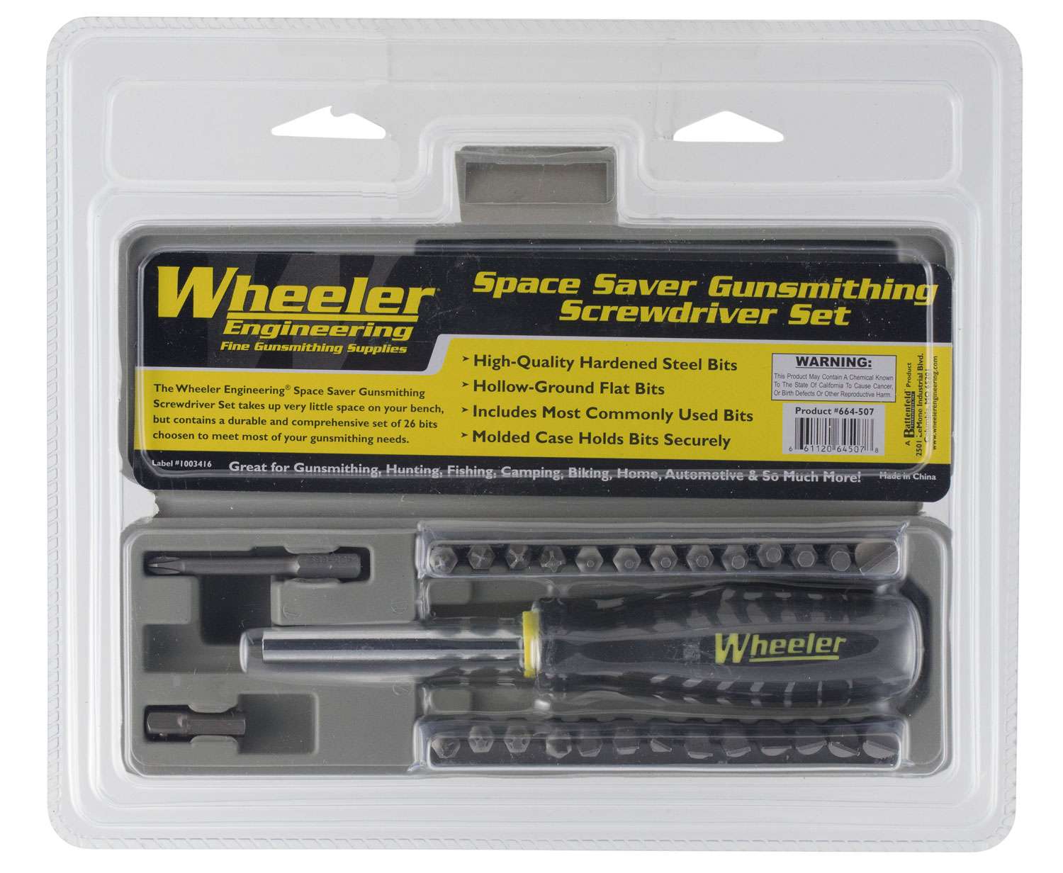 Less than half the size of comparable gunsmithing screwdriver sets! The Wheeler Space Saver Gunsmithing Screwdriver Set takes up very little space on your bench, but contains a durable and comprehensive set of 26 bits chosen to meet most of your gunsmithing needs. Its also the perfect size to include on your trips to the range and the field. Included with the standard, Phillips, hex and torx bits, is a 2" long #2 Phillips bit which is ideal for recoil pad installation and a hex-to-square conversion bit which allows you to use 1/4" square drive sockets and other attachments. The magnetic handle is perfectly sized for gunsmithing needs, allowing you to carry a variety of bits if the need should arise.