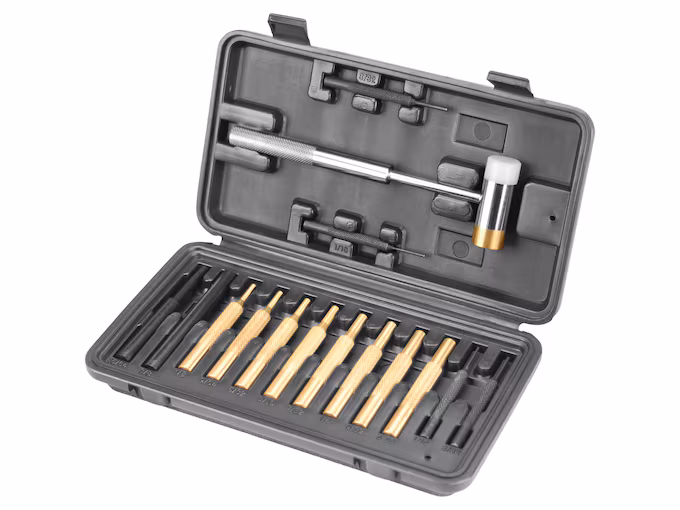 Wheeler's Hammer and Punch Set includes a nylon/brass hammer, eight precision brass punches, four steel punches, and two plastic punches. The hammer's nylon face is non-marring and great for alignment and where a steel hammer is not appropriate, while the brass face can be used for driving pins and punches, and a multitude of other uses. It is 11" long and weighs 8 oz. The brass set includes 4" punches: 1/8", 9/64", 5/32", 3/16", 7/32", 1/4", 9/32", 5/16". It makes a great tool for driving pins, drifting sights, at the shooting range, or on your gunsmithing bench. It comes in a convenient carry case that securely holds all components.