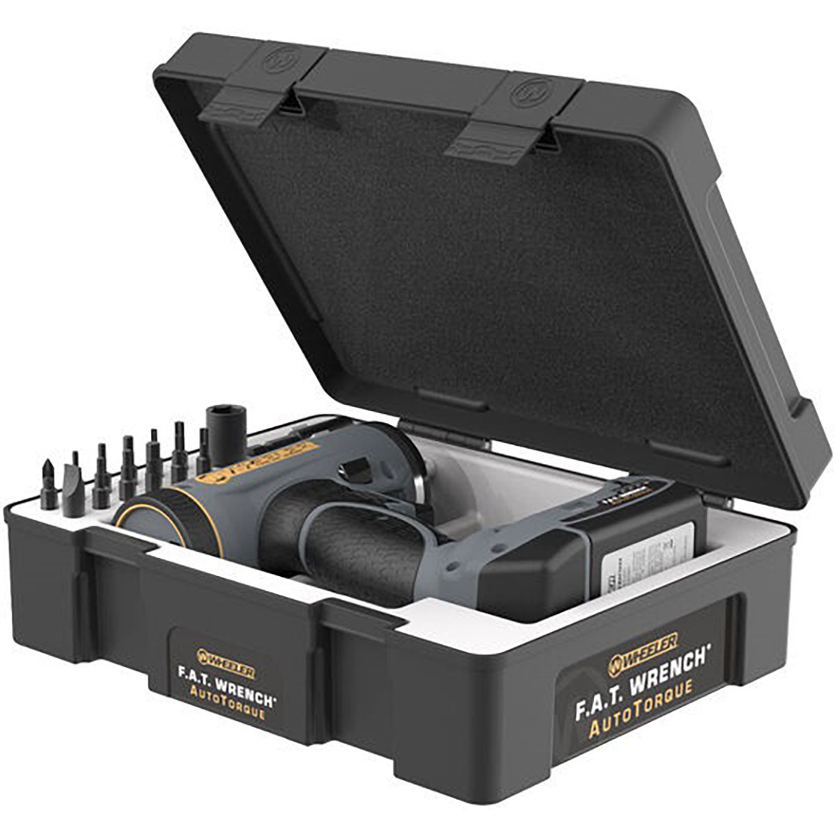 The newest addition to the ever-expanding, iconic F.A.T. Wrench family comes the F.A.T. Wrench AutoTorque, the first battery-operated screwdriver with an integrated torque limiter engineered specifically for the gunsmithing industry. This innovative screwdriver allows you to work faster when installing red dots, scope bases, scope rings, and action screws without sacrificing accuracy. Adjustment is simple, just set the torque between 10-65 in-lbs. on the easy-to-read digital display and get to work. The variable speed 200 RPM motor stops automatically when the desired torque is reached, safeguarding against fasteners being over-torqued or causing damage to your firearm. The rechargeable battery pack boasts a generous 2-hour continuous run-time on a single charge. Includes a 15-piece, black phosphate-coated 1/4"""" bit set that conveniently fits most common fasteners found on modern firearms. All the contents are neatly organized and secured in a premium latching hard case and stacks with other Wheeler sets for smart, convenient storage.