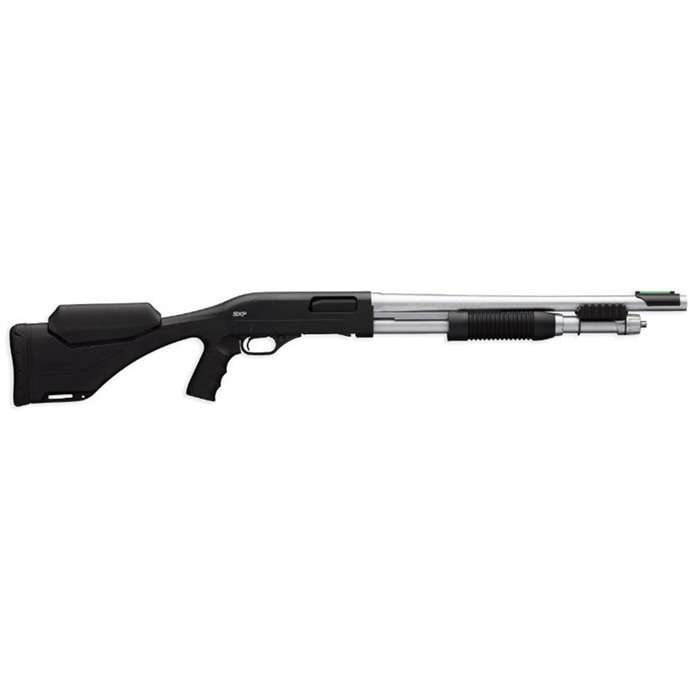 RECEIVER: Aluminum alloy; Matte black finish; Drilled and tapped for scope base - BARREL: Matte chrome 18 barrel with hard chrome chamber and bore - ACTION: 12 gauge and 20 gauge 3 chamber; Pump action - STOCK: Black composite; Textured gripping area; Pistol grip - FEATURES: Two interchangeable comb pieces to adjust drop; Two