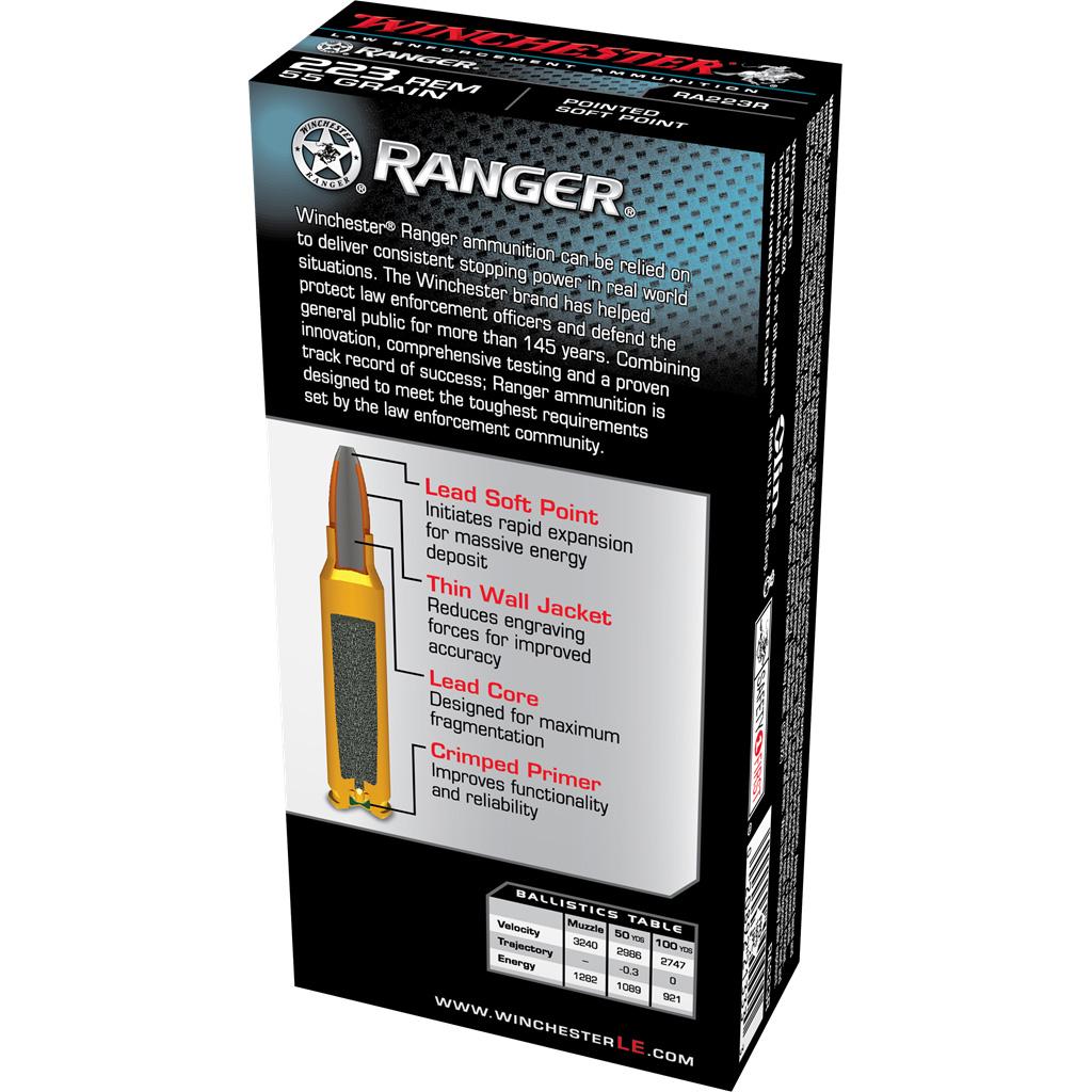 Winchester Ranger represents the highest quality law enforcement-grade ammunition available. This 223 Remington load features a 55-grain pointed soft point bullet designed for rapid expansion and controlled penetration. The pointed design retains velocity over long ranges, while the soft nose initiates quick expansion upon impact for effective energy transfer. Originally developed for law enforcement applications, Ranger ammunition delivers exceptional accuracy and terminal performance.